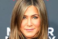 Jennifer Aniston Long Straight Brunette Hairstyle with Side Swept Bangs and Light Blonde Highlights